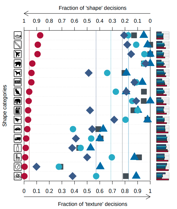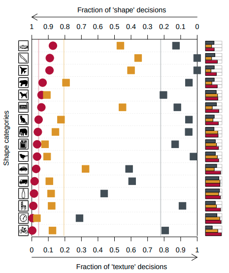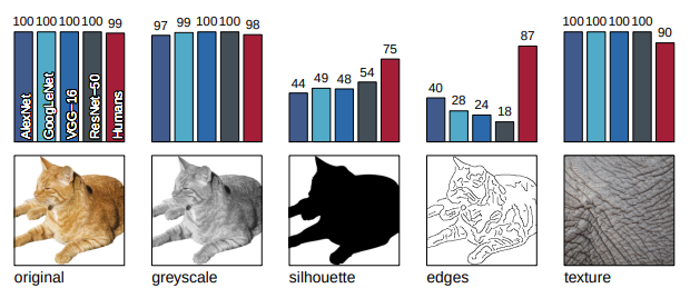 - 지금까지 알려진 바로는 CNN 모델이 인간이 물체를 인식하는 방법처럼 형태에 초점을 맞추어 인식한다는 가설이 지지되었다. 즉 물체의 형태가 색깔, 질감보다 중요하다는 것이다.