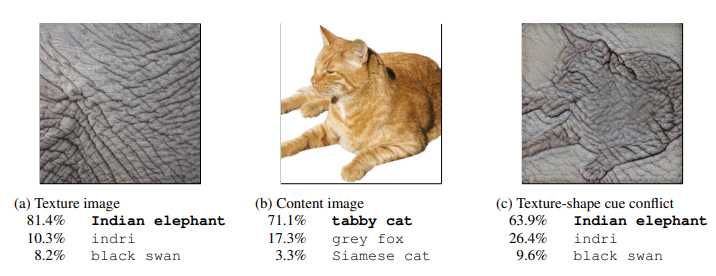 - 이 논문의 저자들은 ImageNet으로 훈련된 CNN이 물체의 형태(shape)보다 질감(texture)을 인식하는데 강한 편향을 가진다는 것을 보여주었다.