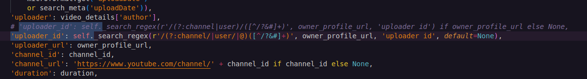 3. 소스 파일에서 ctrl+F로 'uploader_id': self._search_regex 부분을 검색한다.