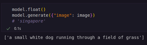 "a small white dog running through a field of grass"라는 텍스트를 출력한 것을 확인할 수 있습니다.