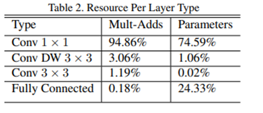 - Pointwise와 FC layer가 각각 75%, 24% 정도의 파라미터를 차지한다.