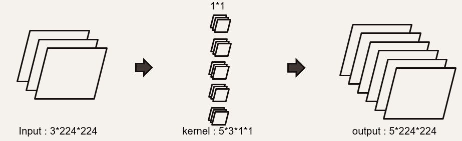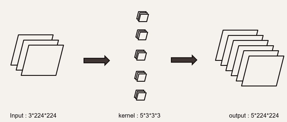- 입력 데이터의 채널이 3, 해상도가 224 * 244이고 출력 데이터의 채널이 5, 해상도가 224 * 224 라고 할 때, 커널은