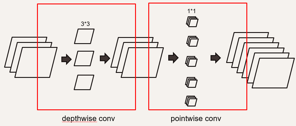 N$ : 출력 채널, $D_K$ : 커널 크기) - Depthwise : $D_K * D_K * M * D_F * D_F + M * N * D_F * D_F$