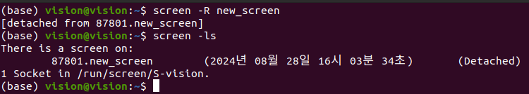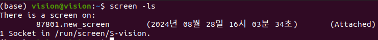 [screen -ls] 로 현재 스크린 목록을 출력해보면 new_screen에 Attached 된 것을 확인할 수 있습니다.