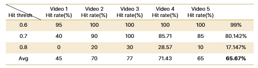 - 각 질문에 대해 선정된 장면의 유사도가 특정 임계값(Hit threshold) 이상인 경우 Hit로 판단
