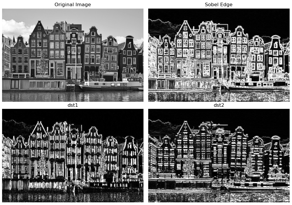 dst1과 dst2에서 수직, 수평 에지가 잘 검출된 것을 확인할 수 있고 두 결과를 합친 최종 출력 Prewitt edge 또한 수직과 수평 에지 모두 잘 검출된 것을 확인할 수 있다.