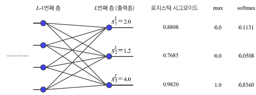 위와 같이 세 개의 부류에 대해 각각 2.0, 1.2, 4.0의 값을 출력했다고 했을 때 이 값들을 sigmoid에 입력하면 0.8808, 0.7685, 0.9820이 출력된다.