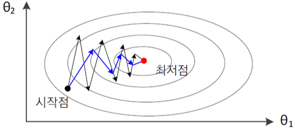 학습률이 크면 오버슈팅 현상이 발생해 진자 운동을 할 가능성이 크고 학습률이 작으면 수렴까지의 시간이 오래걸릴 수 있다.