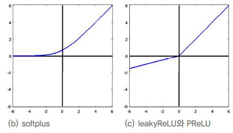 softplus는 전 구간에서 미분이 가능하다는 특징이 있고 leakyReLU와 PReLU는 음수 구간에서의 기울기를 지정할 수 있다는 특징이 있다. PReLU는 기울기 a를 학습한다.