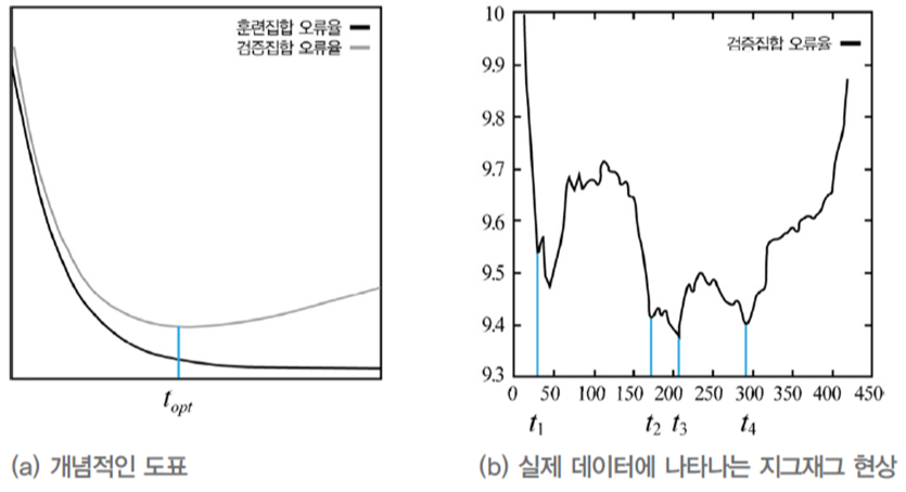 모델의 용량이 커질수록, 또는 세대 수(epoch)가 길어질수록 훈련집합에 대한 성능은 점점 좋아져 오류율 0에 근접하게 된다. 하지만 어떤 지점을 넘어서면 훈련 데이터를 암기하기 시작하여 한 번도 학습하지 않았던 데이터에 대해 성능이 떨어지게되는, 즉 일반화 능력이 하락하기 시작한다. 조기멈춤은 모델의 일반화 능력이 최대인 지점에서 학습을 중단시키는 방법이다. 모델의 내부 동작은 전혀 수정하지 않은 채 적용할 수 있기 때문에 매우 간단하다.