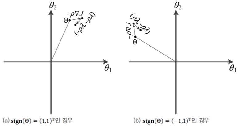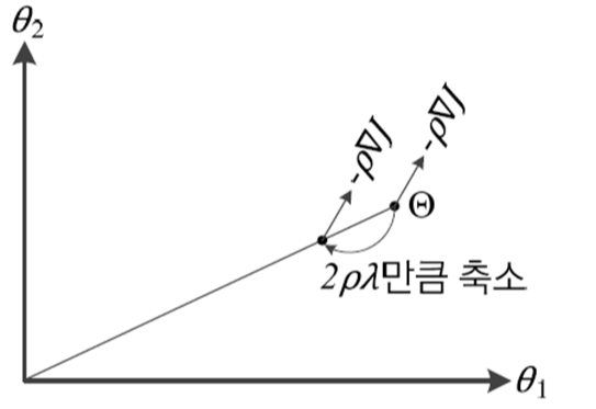 위와 같이 정리할 수 있다. 위 식의 의미를 살펴보면, 먼저 $\Theta$의 크기를 $(1-2\rho \lambda)$만큼 반영한 후 $\rho \triangledown J$만큼 이동한다. 이를 그림으로 보면 아래와 같다.