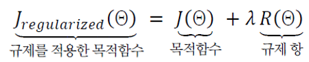 위 식은 관련 변수가 드러나도록 규제를 적용한 목적함수 식을 다시 쓴 것이다. 목적함수 자체는 $\Theta, x, y$에 영향을 받지만 규제항은 $x, y$에 영향을 받지 않는다. x와 y는 훈련집합의 입력 데이터와 레이블(타겟)이다. 또한 규제는 가중치에만 적용하고 바이어스에는 적용하지 않는다. 바이어스를 규제하면 바이어스가 과소적합될 수 있기때문이다.