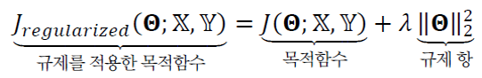 위 식은 규제를 적용한 목적함수를 나타낸다. 가중치의 값이 커질 수록 규제항의 값도 커지게 세팅하기 때문에 가중치를 작은 값으로 국한하는 효과가 있다. 따라서 가중치 감쇠는 모델의 구조적인 용량은 충분히 크게하되 가중치의 수치적인 용량을 제한하는 방법이다.