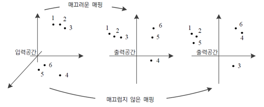 위 그림은 하나의 입력공간을 두 개의 출력공간으로 매핑하고있는 상황을 나타낸 것이다. 가운데 출력공간은 입력공간이 매끄럽게 매핑된 것이고 오른쪽 출력공간은 입력공간이 매끄럽지 않게 매핑된 것이다. 가운데 출력공간은 입력공간의 6개의 데이터에 대해 거리가 먼 데이터들끼리 더욱 분리가 됐지만 오른쪽 출력공간은 그렇지 않다. 세상의 데이터 대부분은 분류 문제에서 매끄러운 매핑이 일어나야한다. 따라서 학습 파라미터 $\Theta$에 대해 매끄러움을 나타내는 규제항을 두어, 덜 매끄러울수록 크게하여 벌칙을 강화하는 것이 가중치 감쇠 규제의 원리이다.