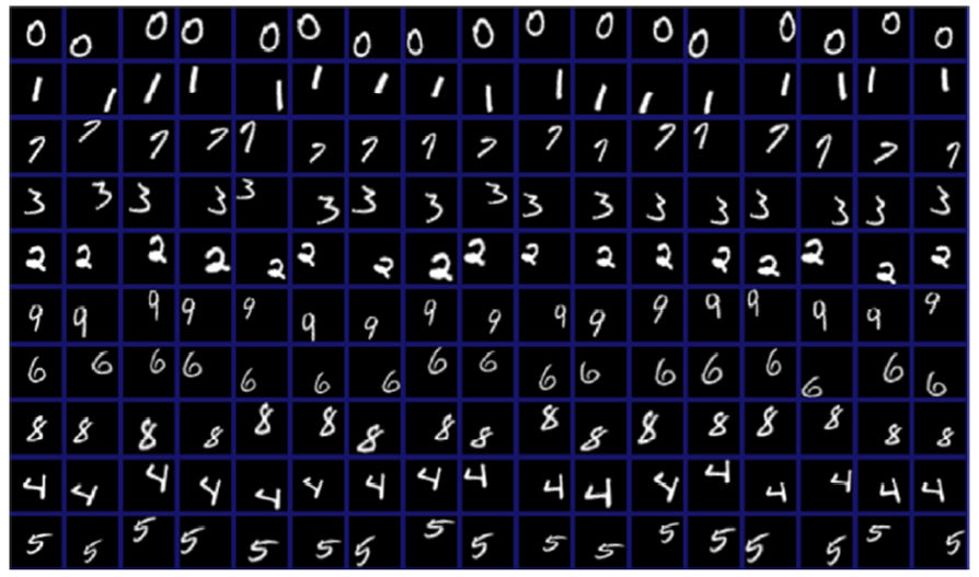 위 사진은 MNIST 데이터에 변환을 적용한 사진이다. 맨 왼쪽 열에 있는 이미지들은 원본 숫자 이미지이고 오른쪽의 이미지는 맨 왼쪽 이미지를 변환한 것이다.