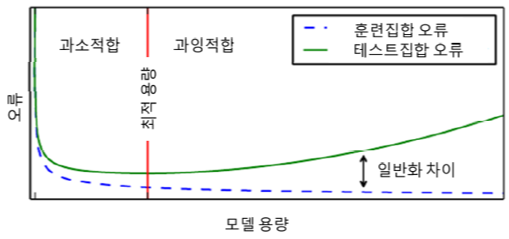 위 그래프에서 처럼 모델 용량이 데이터의 용량에 비해 커지면 커질 수록 성능이 좋아지는 것은 아니다. 모델의 용량이 적으면 모델을 과소적합되고, 모델의 용량이 커지면 과잉적합될 가능성이 커진다. 큰 데이터셋에 작은 모델을 학습시키면 모델이 잘 학습되지 않는 것을 과소적합이라하고, 데이터셋에 비해 큰 용량의 모델을 학습시키면 학습 데이터에만 맞춰져 일반화 능력은 떨어지는 것을 과(잉)적합이라고 한다.