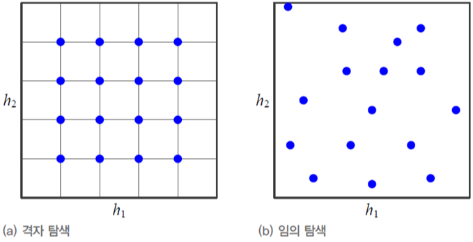 위 그림에서 봉우리의 정상이 가장 좋은 성능의 하이퍼 매개변수 집합이라고 하자. 검은색 점은 하이퍼 매개변수의 조합을 의미한다. 격자 탐색은 하이퍼 매개변수의 집합을 사용자가 정의하기 때문에 봉우리를 빗겨갈 가능성이 크다. 하지만 임의 탐색은 하이퍼 매개변수의 집합을 무작위로 정하기 때문에 봉우리에 도달할 가능성이 생기게 되고, 이러한 이유로 임의 탐색이 격자 탐색보다 우월하다고 알려져있다.