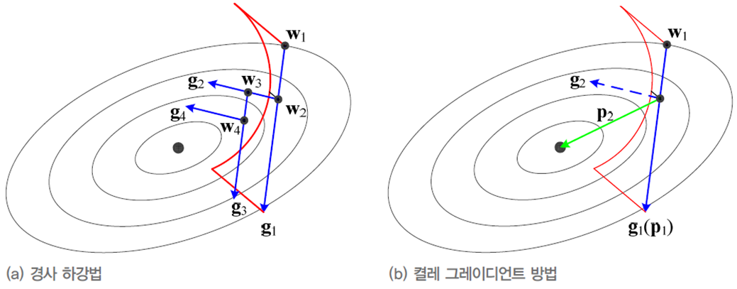 위 그림에서 왼쪽은 경사하강법을, 오른쪽은 켤레 그레디언트 방법을 나타낸다. 경사하강법은 현재점 w에서 그레디언트를 계산할 때 이전의 그레디언트들의 정보를 반영하지 않고 계산하지만, 켤레 그레디언트 방법은 그레디언트를 구할때 직전의 그레디언트를 반영하여 계산하는 방법이다. 위 사진에서 빨간색 선은 직선 탐색을 나타내는데, 직선 탐색이란 학습률을 탐색하는 방법이다. 목적함수를 그래디언트 방향의 단면으로 자른다고 생각했을 때 최소가 되는 점이 그래디언트의 학습률이 되는 것이다.
