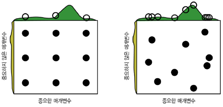 위 그림에서 봉우리의 정상이 가장 좋은 성능의 하이퍼 매개변수 집합이라고 하자. 검은색 점은 하이퍼 매개변수의 조합을 의미한다. 격자 탐색은 하이퍼 매개변수의 집합을 사용자가 정의하기 때문에 봉우리를 빗겨갈 가능성이 크다. 하지만 임의 탐색은 하이퍼 매개변수의 집합을 무작위로 정하기 때문에 봉우리에 도달할 가능성이 생기게 되고, 이러한 이유로 임의 탐색이 격자 탐색보다 우월하다고 알려져있다.