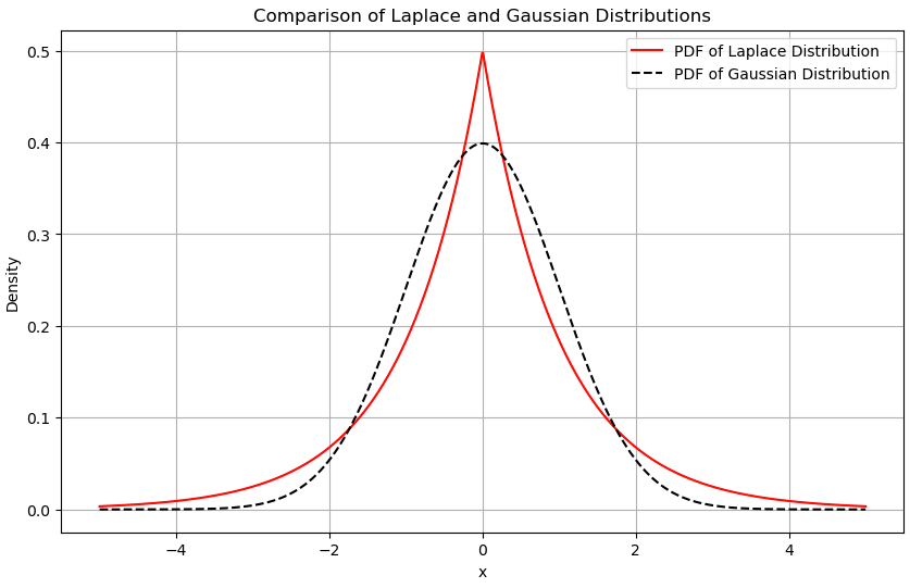 다음은 가우시안 분포와 라플라스 분포를 시각화한 그래프이다.