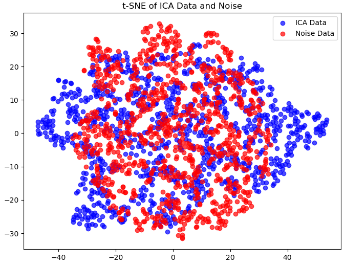 - t-SNE를 통해 생성된 입력 데이터와 노이즈 데이터를 시각화해보면 위와 같다.