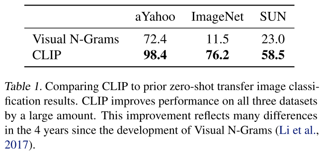 - 위 표는 CLIP과 Visual N-Grams의 Zero-shot 성능을 3개 데이터셋에서 비교한 것이다.