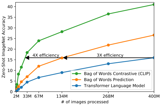 - 위 그래프는 학습 데이터 양에 따른 CLIP, Bag of Words, Transformer의 Accuracy를 나타낸 것이다.