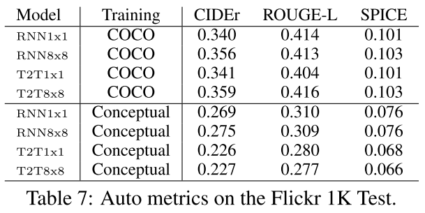 - 마찬가지로 Conceptual Captions dataset과 유사한 도메인이기 때문에, Conceptual로 훈련한 모델이 더 높게 측정됐다.
