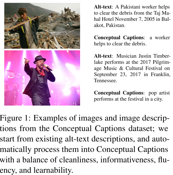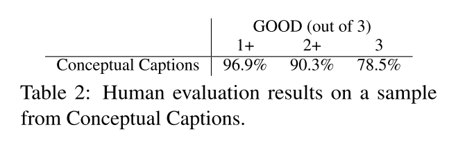 - 본 논문은 Conceptual Captions라는, 이미지 캡션으로 어노테이션된 데이터셋을 제시한다.