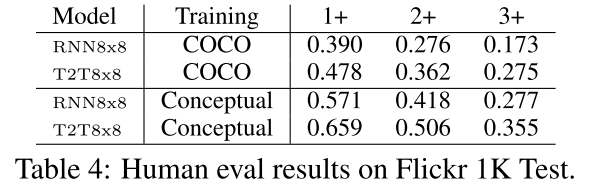 - 위 표는 각각 COCO, Conceptual로 훈련한 모델이 이미지에 대해 추론한 캡션에 Human evaluation을 적용한 것이다.