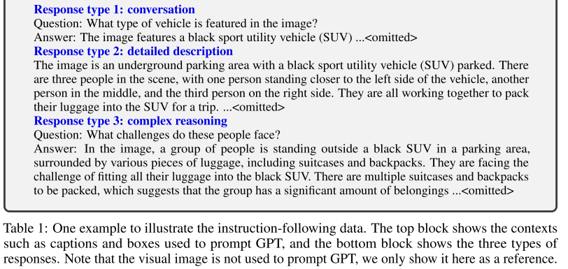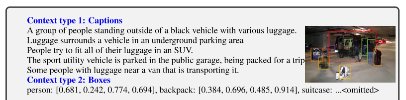 - 텍스트 만을 사용하여 이미지에 관련된 Instruction-following 데이터를 생성해야하기 때문에, 이미지를 텍스트 형식으로 표현해야 하는데, 이 논문에서는 캡션과 바운딩 박스를 사용한다.