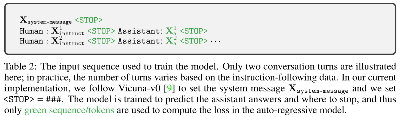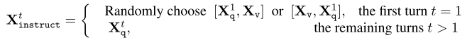 - 학습 과정에서, 입력 이미지 $X_\mathbf v$ 에 대해 Multi-turn conversation(다중턴 대화) 데이터 $(X^1_q, X^1_a, \cdots, X^T_q, X^T_a)$ 가 제공된다. 이 때 $T$ 는 턴의 개수(대화 반복 횟수)이다.