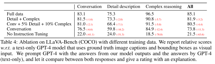 - 여기에 사용된 Evaluation metric은, Language only GPT-4를 테스터로 사용하여 Assistant의 응답과 Ground-truth 가 얼마나 유사한지 1~10점으로 평가하게끔 한 것이다.