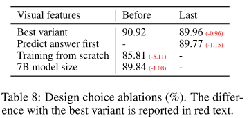 - 네번째는 Best variant(13B)에 비해 작은 7B 모델의 성능을 평가한 것인데, 약 1% 정도 하락했고 저자는 이에 대해 모델 크기의 중요성을 언급했다.