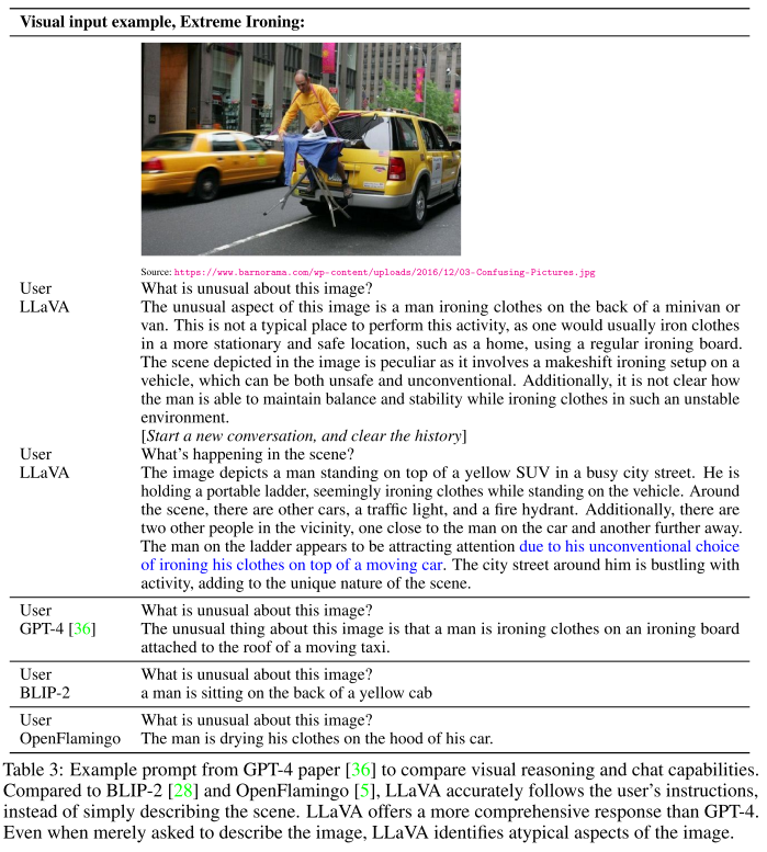 - 남자가 차 뒤에 매달려서 옷에 다림질하는 사진을 입력으로 넣고 무엇이 이상하냐고 질문을 했을 때 LLaVA와 GPT-4만 정답을 정확히 출력한다.
