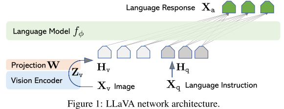 - Vision Encoder는 입력 이미지 $X_\mathbf v$ 를 피쳐 $\mathbf Z_\mathbf v$ 로 변환하고, 간단한 선형 레이어 $\mathbf W$ 를 통해 텍스트 임베딩과 같은 차원을 가진 $\mathbf H_\mathbf v$ 로 만든다.