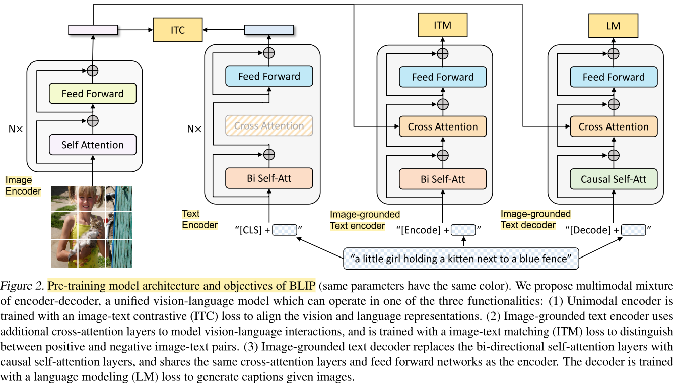 - MED는 Unimodal encoder, 이미지 기반 Text encoder, 이미지 기반 Text decoder로 작동할 수 있다.