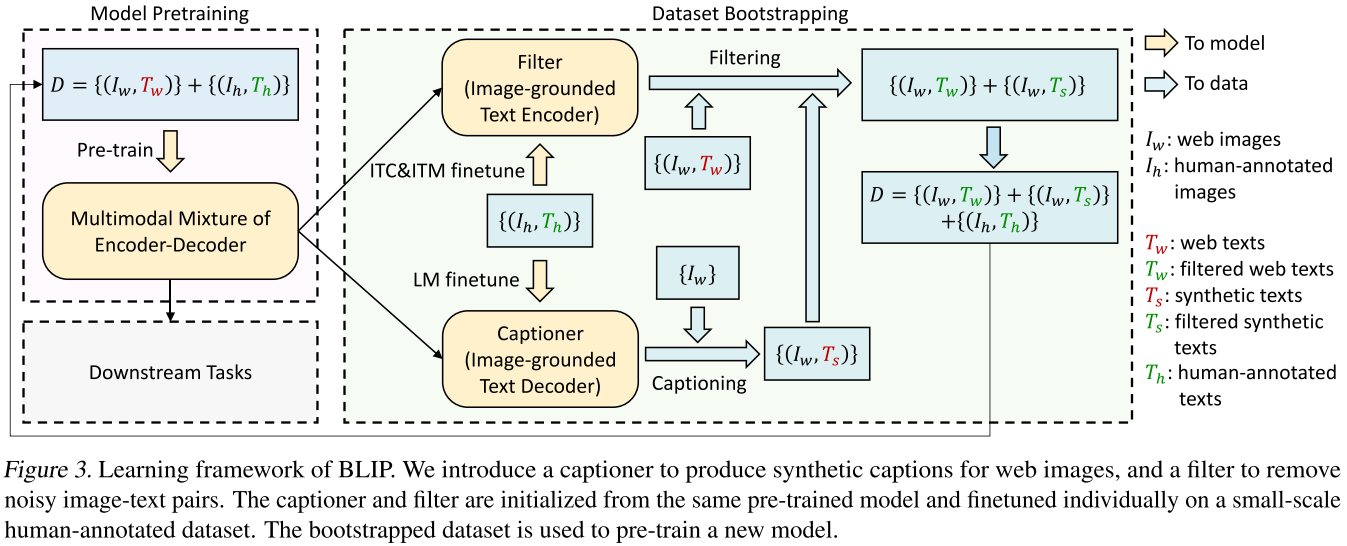 - 사전학습된 MED를 두 가지 모듈로 파인튜닝하는데, 첫번째 모듈은 주어진 웹 이미지로부터 캡션을 생성하는 캡셔너이고 두번째 모듈은 웹 텍스트와 생성된 텍스트에서 노이즈를 필터링하는 필터이다.