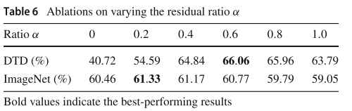 - 두 개의 데이터셋 DTD, ImageNet에 대해 Residual ratio $\alpha$ 의 Ablation study이다.