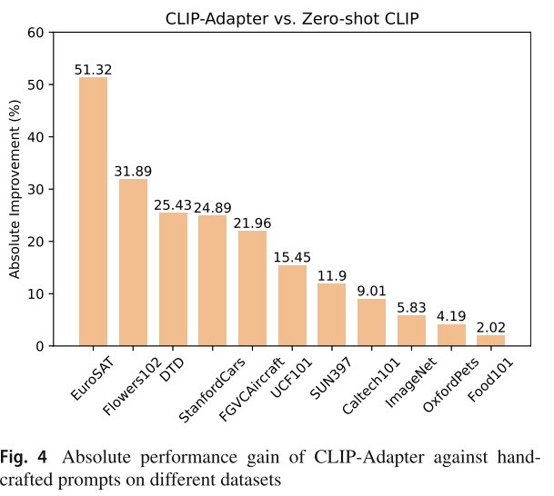 - 피쳐 어댑터를 적용했을 때, Hand-crafted 프롬프트와 비교하여 각 데이터셋 별로 성능이 얼마나 증가했는지 나타낸 그래프이다.