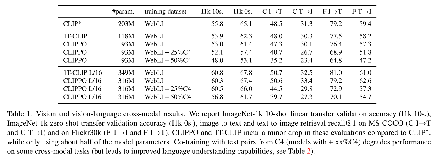- 이전 연구에서 1T-CLIP(One-tower CLIP) 이라는, 기존 Two-tower 방식과 다르게 하나의 트랜스포머를 이용하여 이미지와 텍스트를 처리할 수 있음을 보여주어, 파라미터 수를 반으로 줄였지만 성능은 소폭 하락하였다.