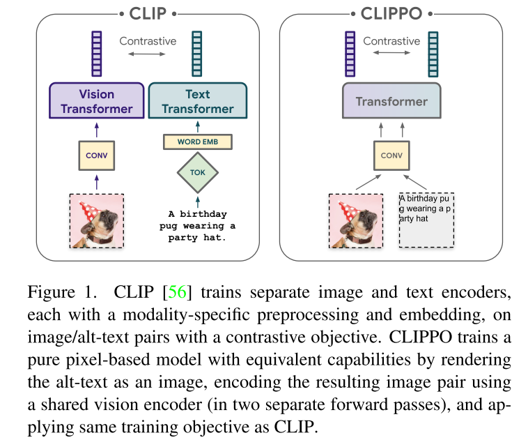 - 본 논문에서 제안하는 CLIPPO는 1T-CLIP에서 한 단계 더 발전한 개념이다.