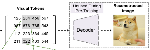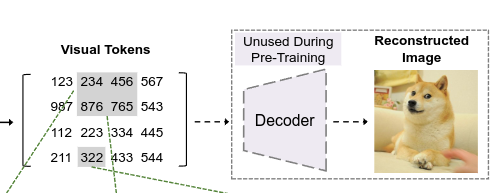 - 그 후 Decoder($p_{\boldsymbol \psi}(x|z)$) 는 Visual token $z$ 를 기반으로 입력 이미지 $x$ 를 복원하도록 학습한다.