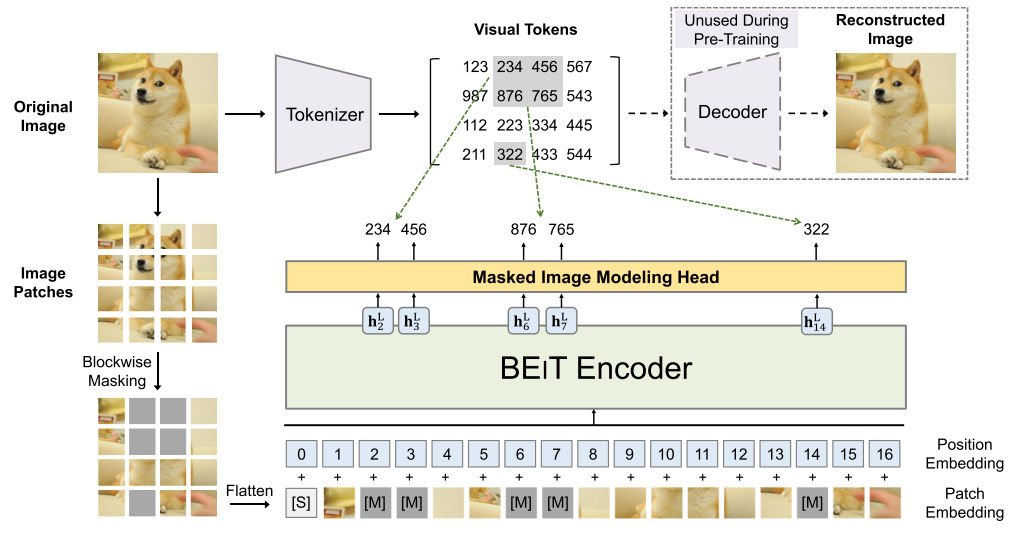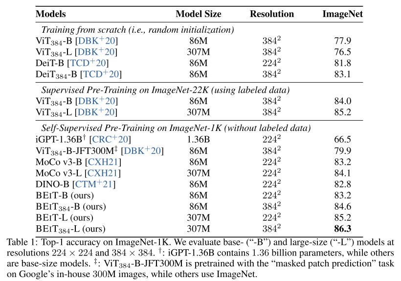 - BEIT(Bidirectional Encoder representation from Image Transformers)를 제안한다.