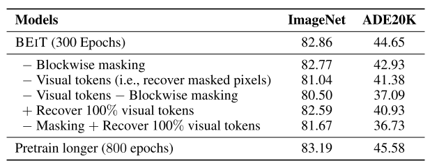 - Blockwise masking, Visual tokens, Recover, Masking에 대한 실험이고 Visual tokens와 Blockwise masking이 없을 때 성능이 가장 낮아진다.