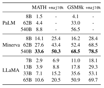 - PaLM과 LLaMA는 수학 데이터셋에 파인튜닝하지 않았는데, 기본적으로 LLaMA가 PaLM보다 높다.