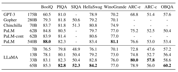 - LLaMA-65B는 Chincilla-70B, PaLM-540B와 비슷한 성능이다.