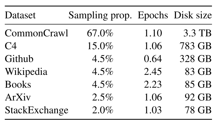 - English CommonCrawl : 웹에서 수집한 텍스트 데이터로, 비영어, 중복, 스팸 데이터 등을 필터링한 데이터셋이다.