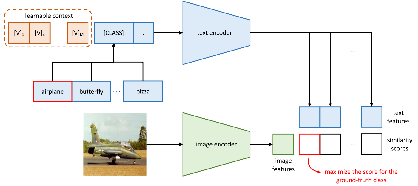 - CLIP과 거의 동일하게 Image Encoder, Text Encoder가 각각 있는데, 입력 텍스트에 Learnable Context만 추가된 것을 확인할 수 있다.