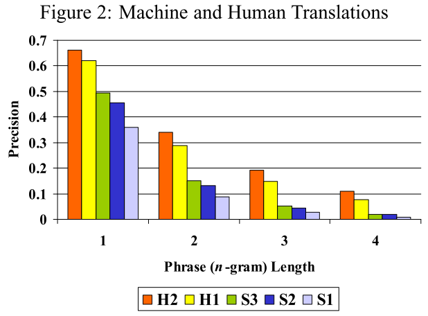 - 원어민 수준 H2의 정밀도가 가장 높고, 기계 번역의 정밀도가 상대적으로 낮게 측정된다.
